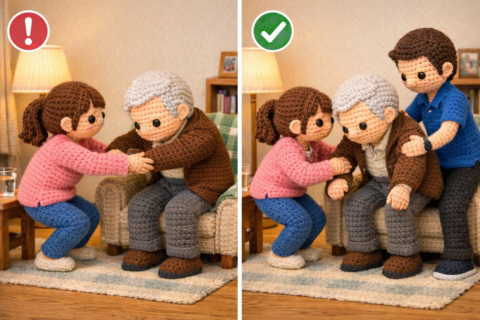 Le expliqué que ayudar no es lo mismo que cargar. Acompañar significa colocarse cerca, mantener la espalda recta, flexionar las rodillas, activar el abdomen y permitir que la otra persona haga su parte. Es guiar el movimiento, no sustituirlo. Es usar el peso del propio cuerpo y la fuerza de las piernas, no convertir la zona lumbar en el punto de apoyo principal.